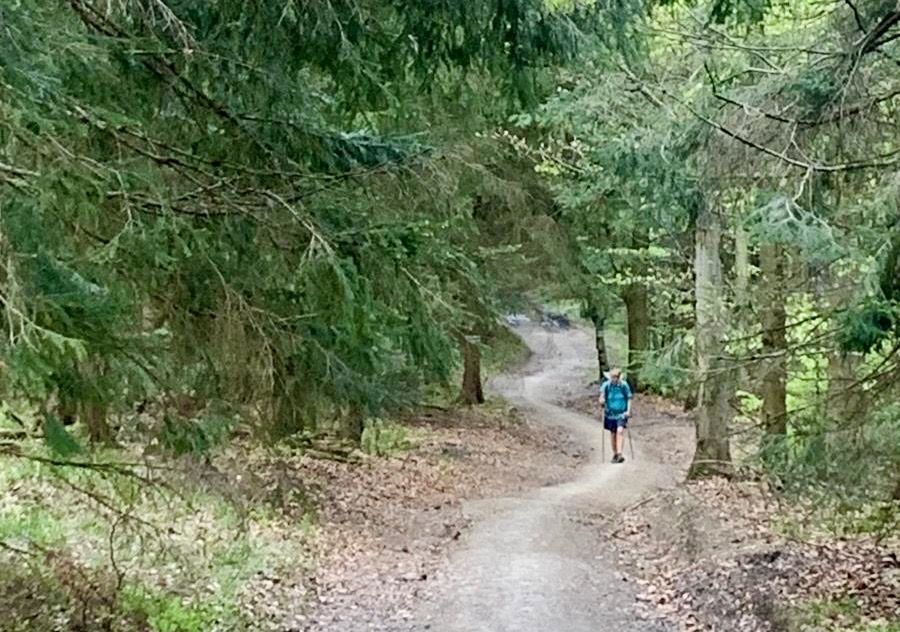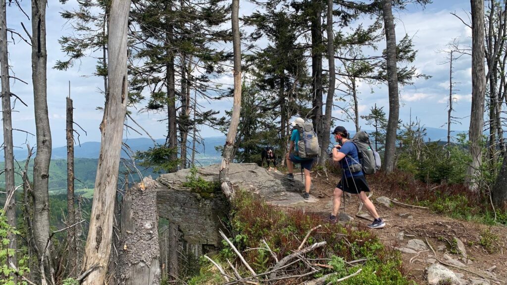 Dnes je skutečně vedro. Koupeme se v potoce, peru si triko a suším ho na batohu. Čeká nás přes 500 m převýšení na Ostrý. Vlečeme se pomalu. Převažují listnaté stromy.