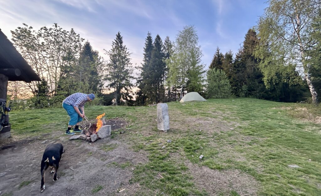 Stavím stan, Marťa bude spát v přístřešku. Rozděláváme oheň. Nádherný večer s výhledy na Malou a Velkou Fatru.