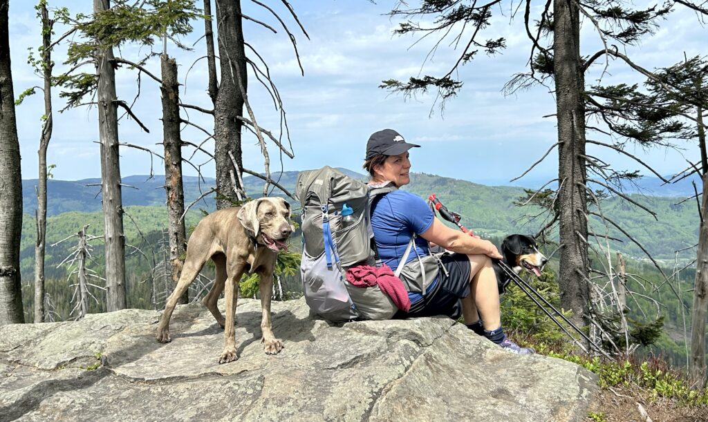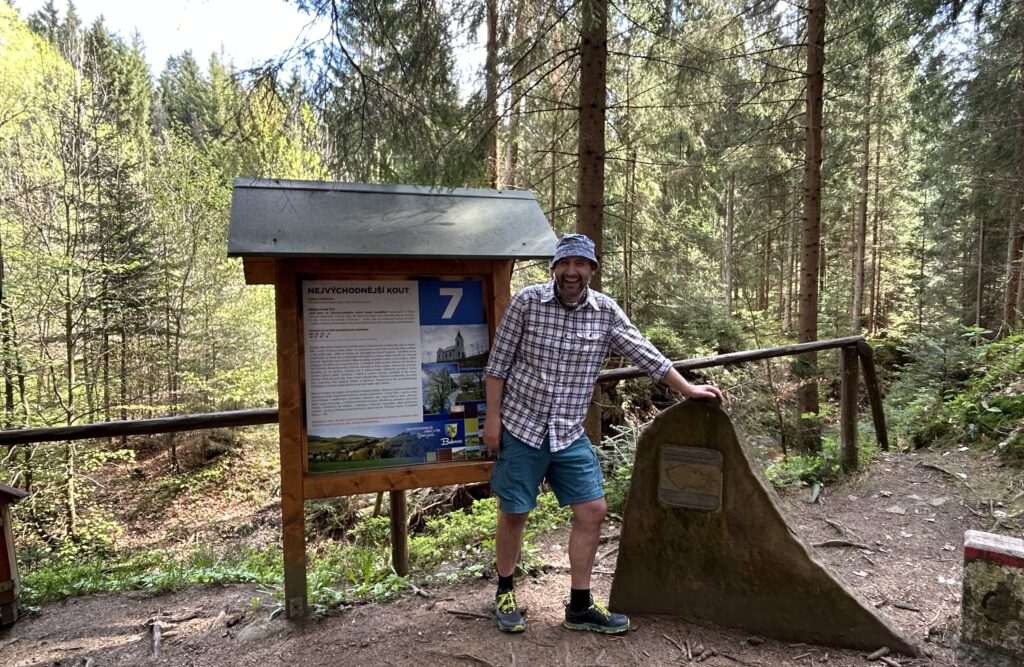 Už jsme se napojili na hřeben na červenou značku a tedy na hlavní etapu Stezky Českem. Lidí o poznání přibylo. Jdeme po hranicích se Slovenskem na sever k našemu zaparkovanému autu. Míjí mne povědomej borec s ultra malým batůžkem. Já ho nepoznám, ale on mne jo. Je to Pavel Sabela se kterým jsem měla před pár týdny video hovor. Kecali jsme o amerických trailech. Mám radost, že se vidíme osobně. Je to největší česká trailová legenda. Absolvoval velké množství amerických trailů, je držitelem Triple Crown. Pro mne je to celebrita. Chvíli kecáme a pak jdeme každý svou cestou. Mám z toho setkání radost. Večer má dost pršet, spěcháme všichni domů.