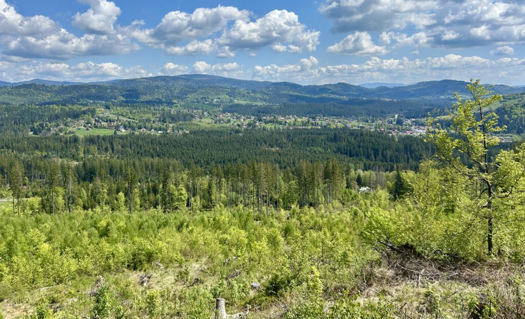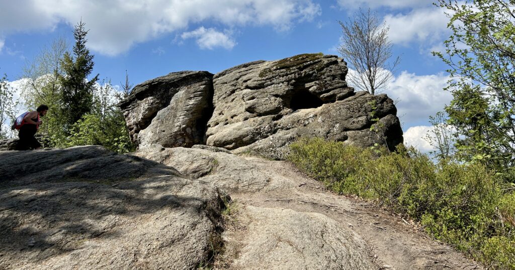 Bereme bágly a stoupáme po červené značce do kopců, které nesou název Jablůnkovské mezihoří. Malá odbočka ke skalám na Čertovy mlýny a pak lezeme na kopec Girová ve výšce 840 m. Ideální místo na noc.