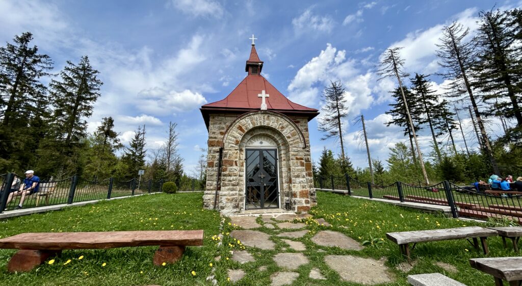 Před osmou vycházíme po červené značce na východ, směr Malý Polom. Míjíme zavřenou turistickou chatu Slavíč, je moc krásná. Na nás je stejně příliš brzy, před chvílí jsme snídali.