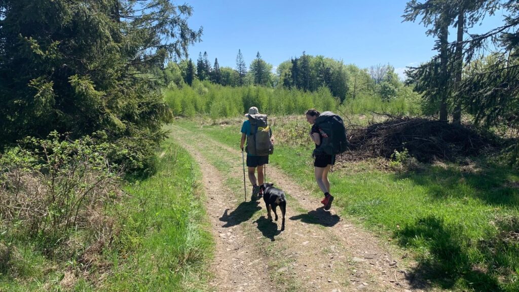 Na nejvýchodnějším bodě ČR jsme po deváté hodině. Jenom za tu chvíli jsme potkali asi deset lidí s batohem na noc. Přecházíme potok a lesem projdeme na silnici do Polska. Vezmeme to na hřeben Slezských Beskyd Polskem.