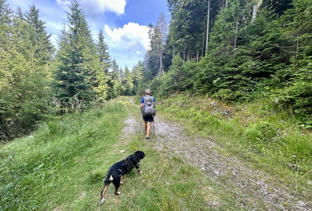 Sestoupíme k myslivně a napojíme se na lesní asfaltku po modré značce. Míjíme myslivnu, ovce se pasou na stráni, tak snad dobrý, ale omyl. Vyráží na nás smečka psů, vede jí vzteklý obrovský čuvač se stejnou fenou, štěňaty a dalšími psy. Obklopí nás, čuvač jde hned po Cherry, bráníme jí hůlkama, řveme, psi zuřivě štěkají a snaží se nás všechny pokousat. Cherry jen uhýbá, nemá žádnou šanci. Z dálky tu melu pozorují pastevci, řveme na ně ať si ty psy odvolají, nic. Jen čumí. Pak se pomalu přišourá paní, beze slova a jediného pohledu naším směrem si čuvače odtáhne. Zbytek smečky jde stále po nás, ale to už utíkáme, bez vůdce to za chvíli psiska vzdají. Tak to byl jeden z nejbrutálnějších útoků od psů co jsem zažila. Šli hlavně po našem pejskovi, Cherry za celou dobu nevydala hlásek, jen uhýbala, nebýt nás tak je na cucky. No máme o čem přemýšlet, vyvázly jsme naštěstí bez úhony. Nesnáším blbý lidi.