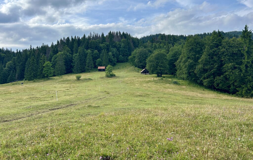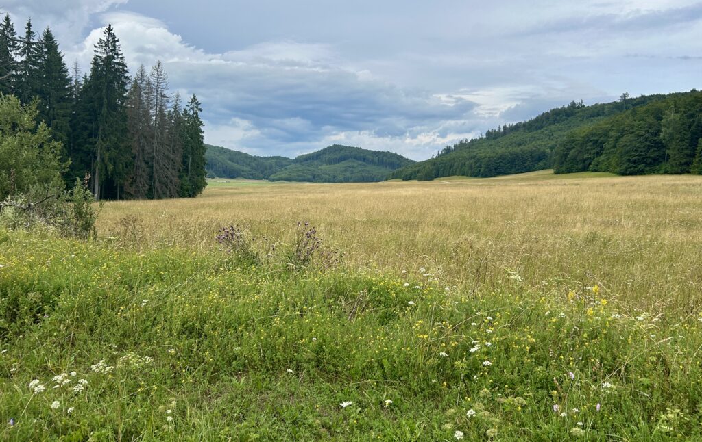 Ve dvě hodiny odpoledne jsme se dovlekly konečně k první louce, místo se jmenuje Studňa na Muráňskej planině ve výšce 1.170 metrů. Tady to konečně vypadá jako planina, doposud jsme šly lesem. Nahoře už hovada nejsou.