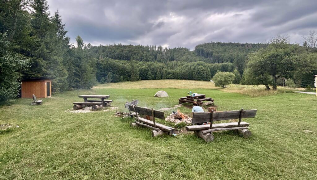 Pokračujeme po červené značce na Velkou louku – Piesky. Nádherné místo, hned se nám tu líbí, stolky a lavičky, ohniště, čistý záchod a legální stanování maximálně na dvě noci Je šest večer, jenomže nemáme dost vody. Studánka je od sud necelé dva kilometry, tam se nám nechce. Cyklo rodinky se ptáme jestli neví o nějaké vodě blíž, dostáváme od nich velkou flašku minerálky. Tak s tím už nějak vyjdeme.