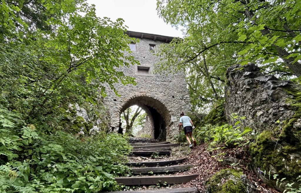 Stoupáme na zříceninu hradu Muráň. Kousek před ní stojí zavřená hospoda, je příliš brzy. Ze zříceniny máme slušný výhled, vyfotíme si ho, za chvíli na nás padá mlha. Muráňský hrad měl pohnutou historii, čteme si na tabulích osudy obyvatel, nic veselého se tu nepíše.