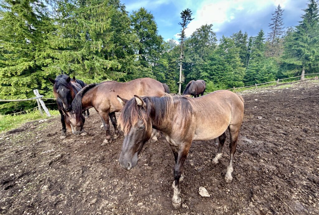 Stavíme stan a rozděláváme oheň. Na druhé straně louky jsou v ohradě ustájení tažní polodivocí koně Muránsky norik. Rády bychom ty koně viděly, ale je to daleko. Třeba ráno. Výška 950 m.