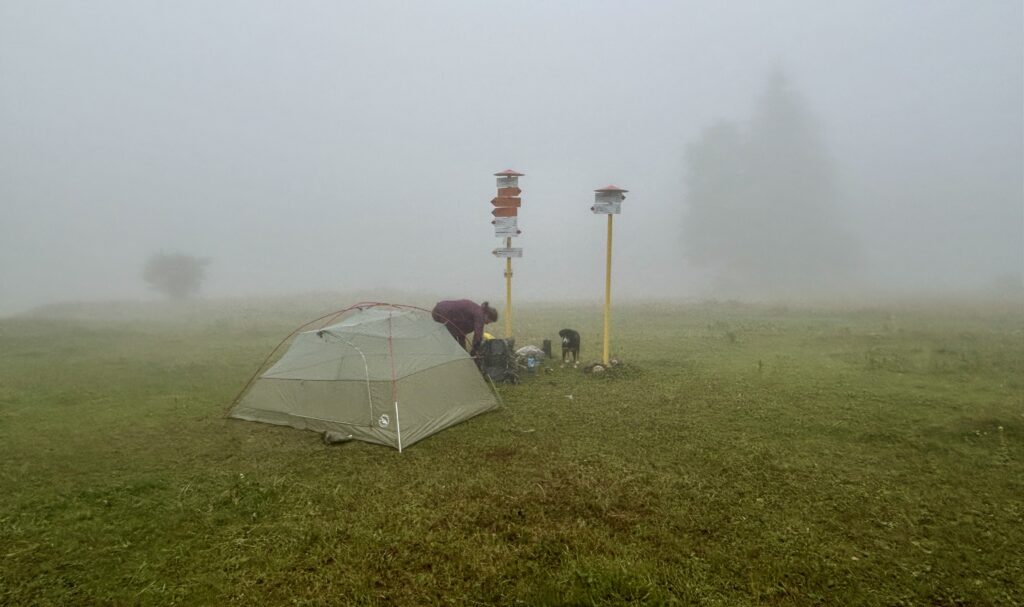 V noci déšť. Krásně jsme se vyspaly. Vstávám o půl páté, vařím snídani, hlavně teda kafe. Holkám se vstávat nechce, ale nic jiného jim nezbývá. Venku je vlhko, momentálně neprší. Cherry se snaží vrátit do stanu, jenomže ho balíme. Odcházíme v šest. Brzy má začít pršet, není na co čekat. Máme před sebou 13 kilometrů k autu.