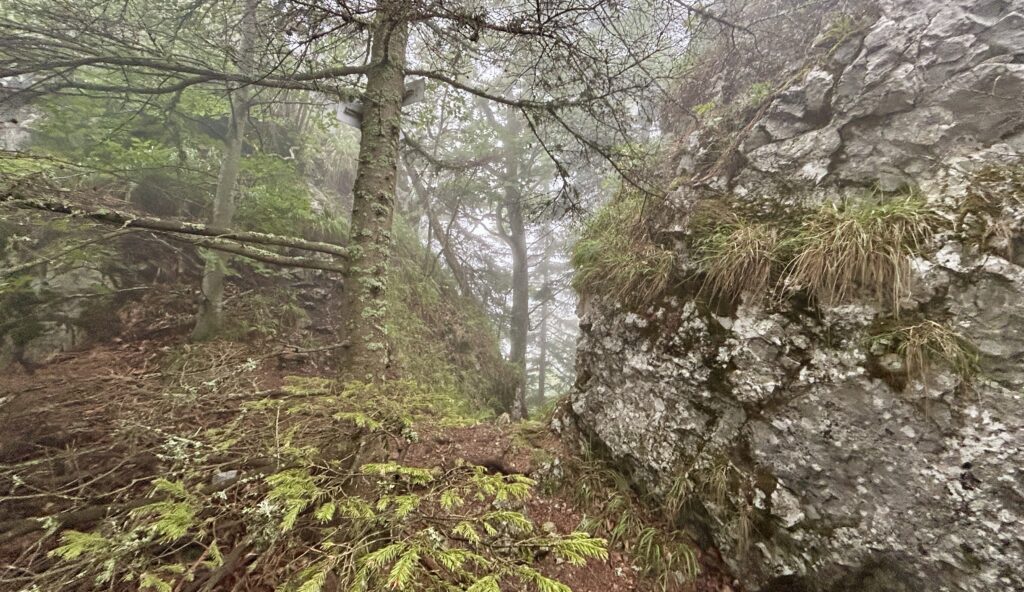 Sestupujeme ze sedla po žluté s odbočkou na Skalní bránu. Je mlha, výhledy prakticky žádné. Po dvou kilometrech se blížíme k myslivně Stožky. Na louce si čteme tabuli, že se tu pasou ovce, hlídají je psi. Máme si vzít psa na vodítko, hned to provedu a pokud k nám přiběhne pastevecký pes, máme zůstat v klidu stát. Tak fajn, jsme poučené.