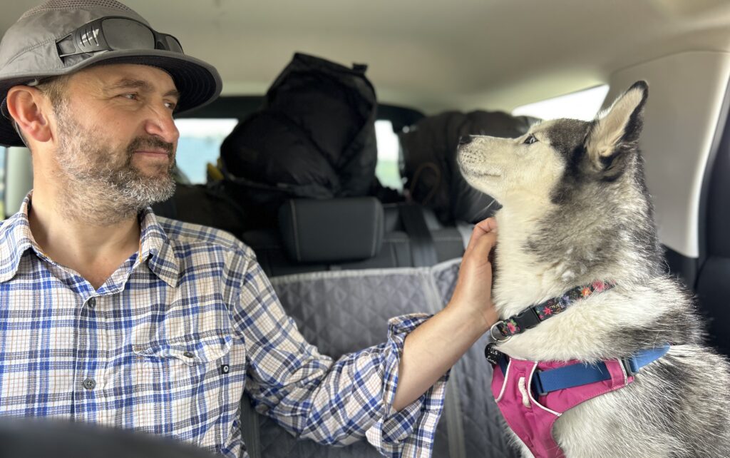 Hned u motelu začínáme stopovat, musíme ale kousek popojít, aby měli auta kde zastavit. Trvá to 13 minut, než nám zastaví hiker se svým huskym Lunou. Jedou na tůru přesně do našeho Monarch Passu. Paráda. Pejsek se nechá hladit.