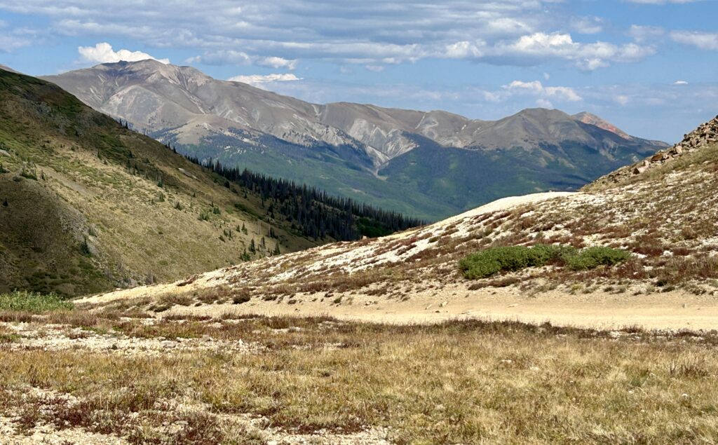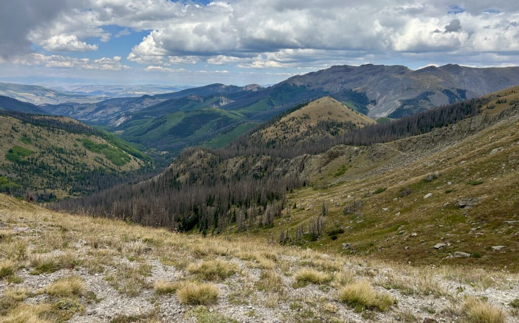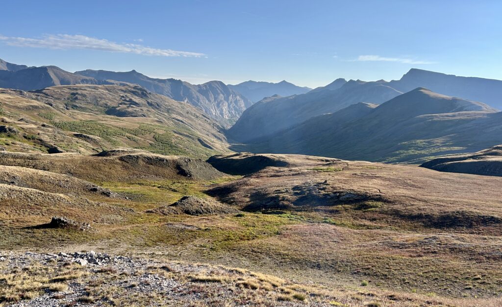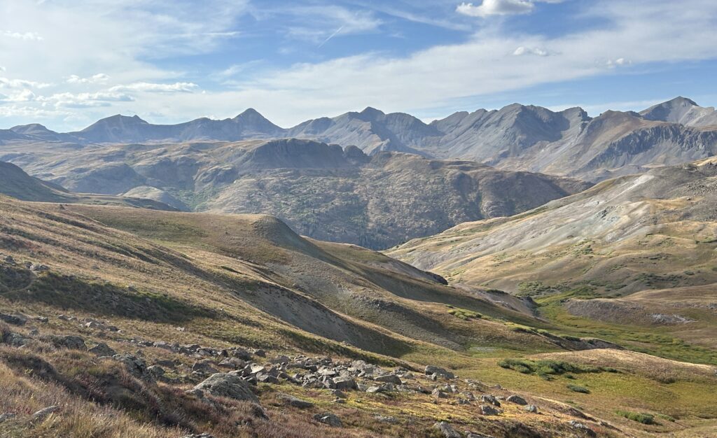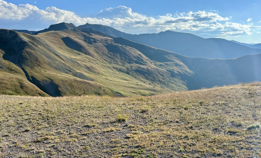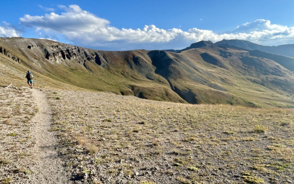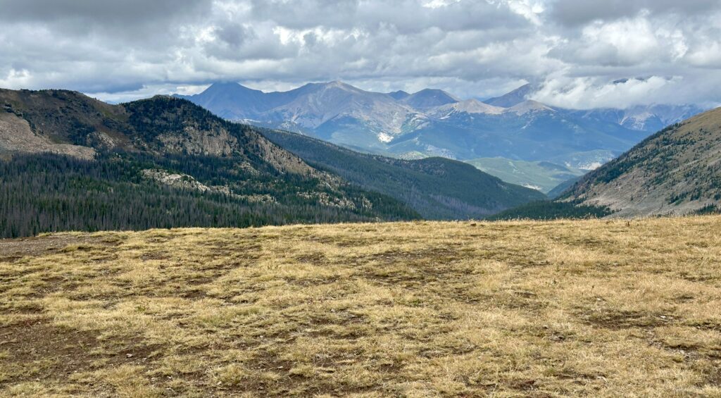 Kocháme se pohledem na okolní Skalisté hory. Vysoké kopce a zatravněná sedla. Držíme se stále lehce pod 4.000 metrů. Na nebi se honí mraky, snad nebude pršet.