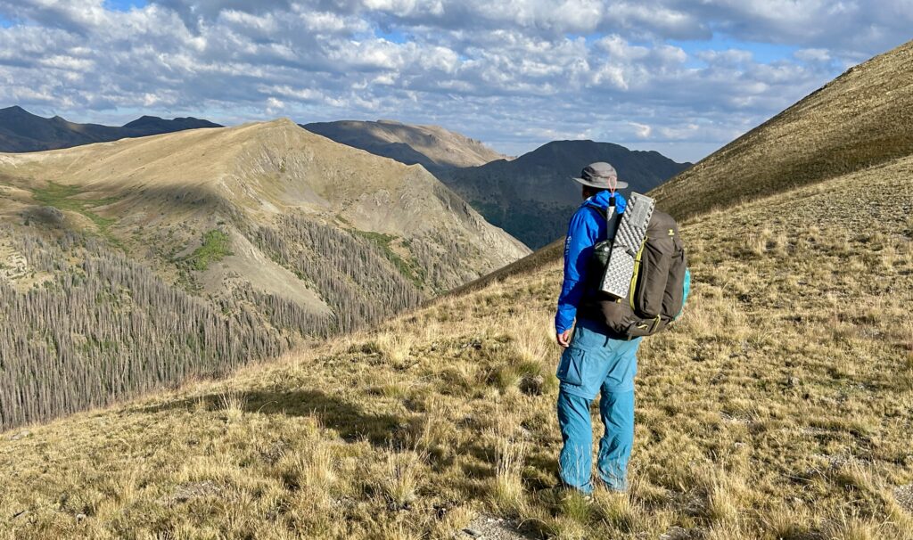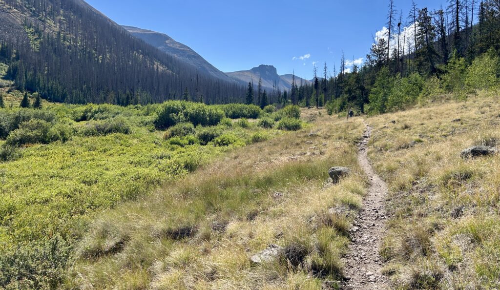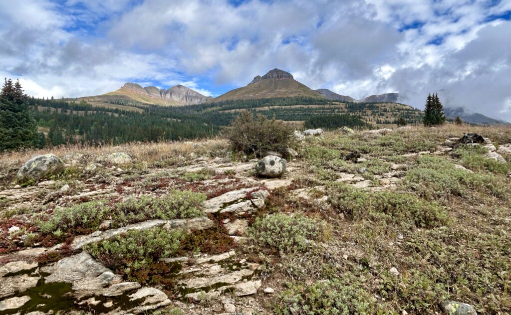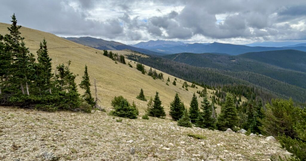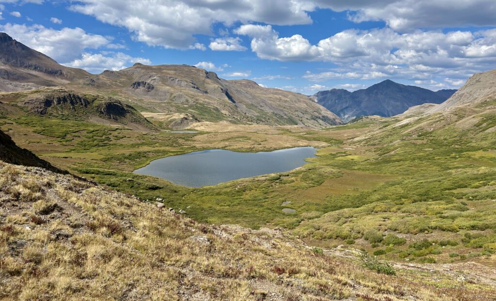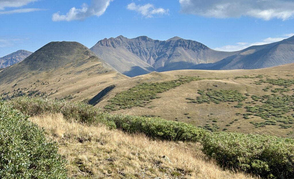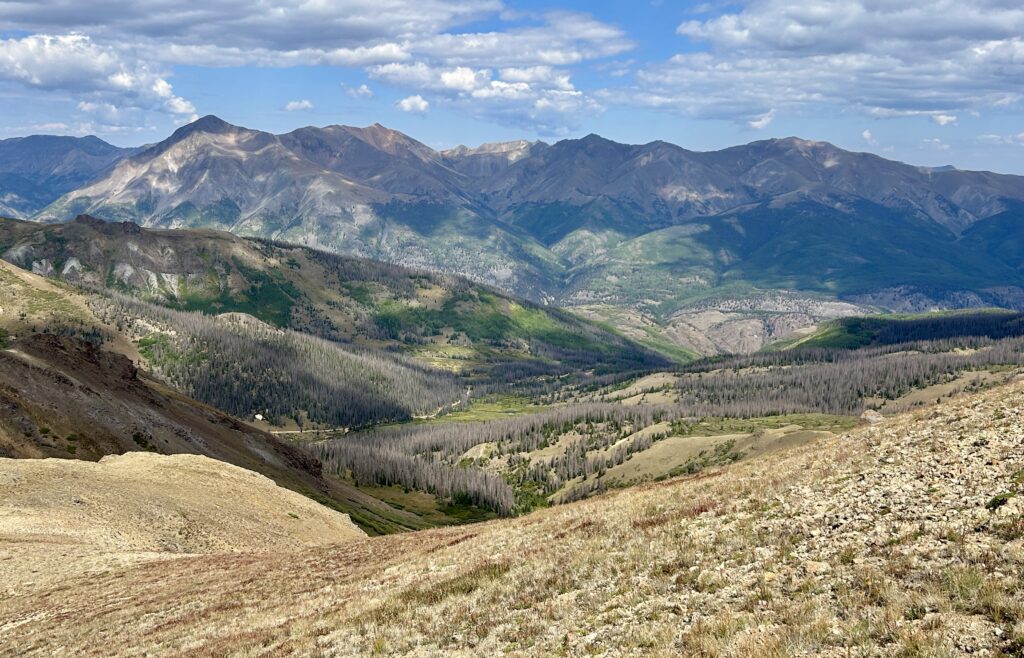 Kocháme se pohledem na okolní Skalisté hory. Vysoké kopce a zatravněná sedla. Držíme se stále lehce pod 4.000 metrů. Na nebi se honí mraky, snad nebude pršet.