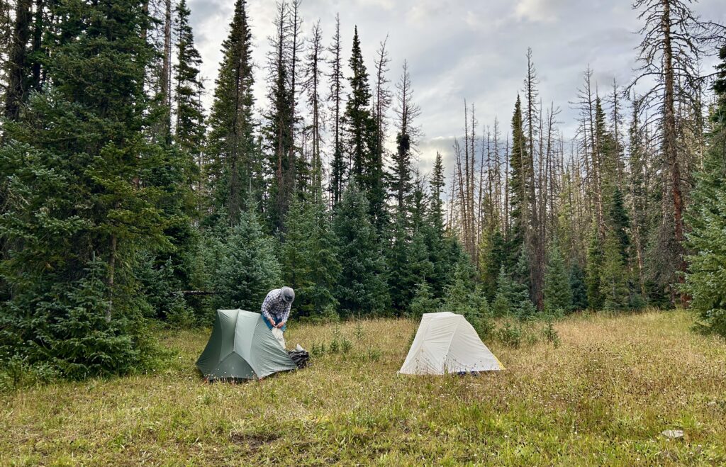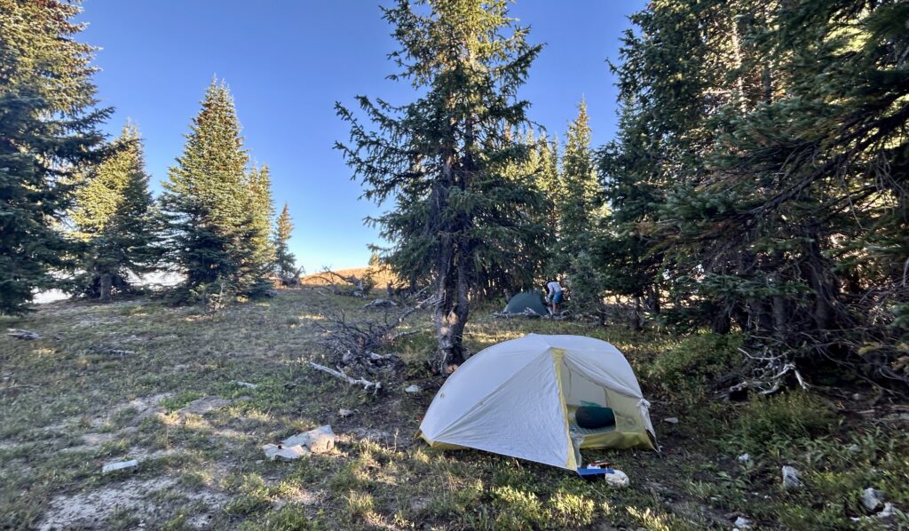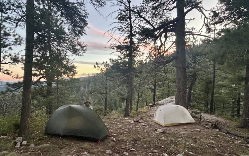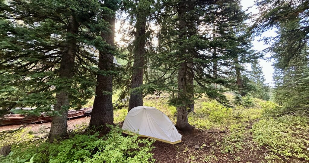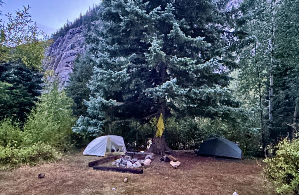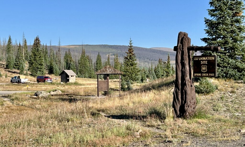 V podvečer sestupujeme do sedla Spring Creek Pass. Bereme si z potoka vodu na noc. Na parkovišti si čteme tabule a přemýšlíme, kde postavíme stany. Přímo tady to nejde, bylo by to na pokutu 105 $, jeden hiker tuto zkušenost popsal na FarOut. Parkoviště je pouze denní areál. Musíme kousek popojít do lesa.