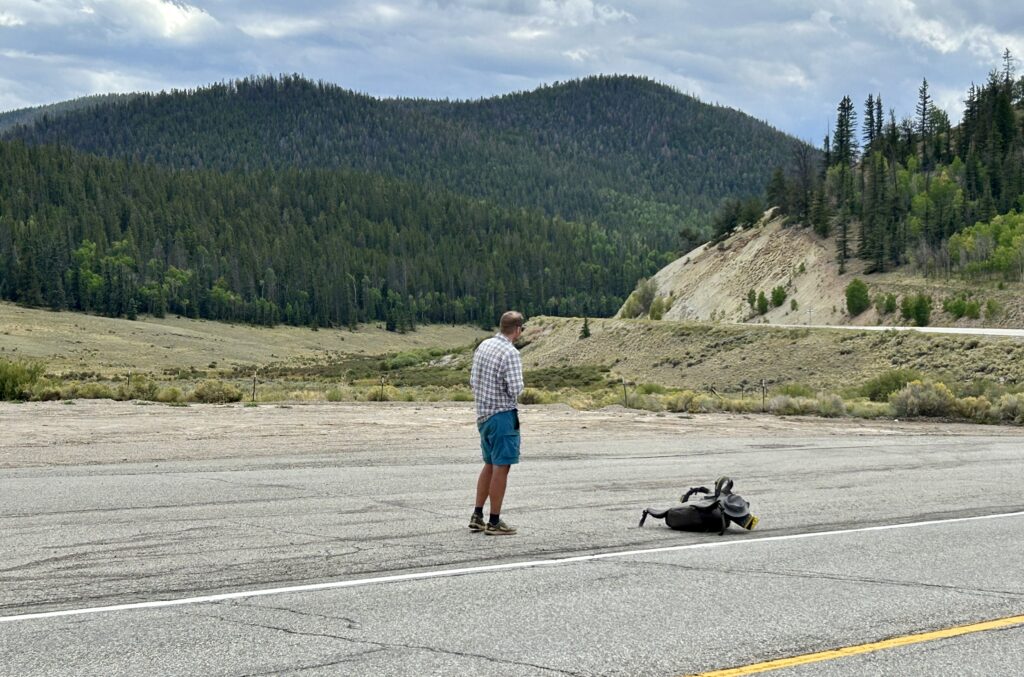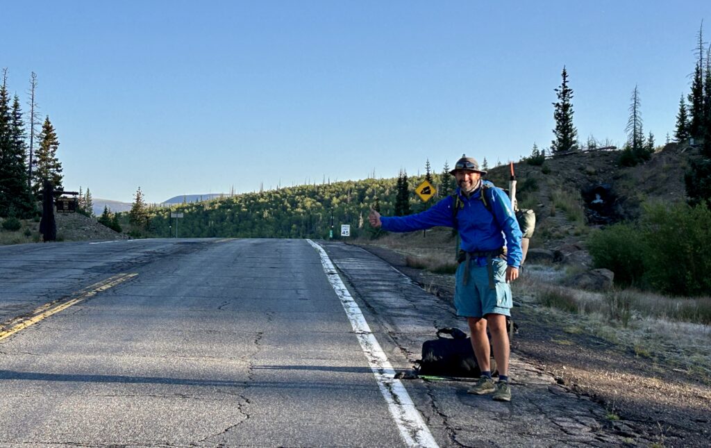 Před šestou stojíme zpátky na silnici, našim směrem nejede skoro nic, tak jedno auto za 5 minut. Máme obavy, že v Saguache zůstaneme na noc. Po 17 minutách nám staví pán v důchodu, je to fyzik, před třemi roky byl na konferenci v Praze. V kufru má batoh, taky jede na tůru, půjde kousek CDT. Máme velké štěstí, že jsme narazili na hikera.