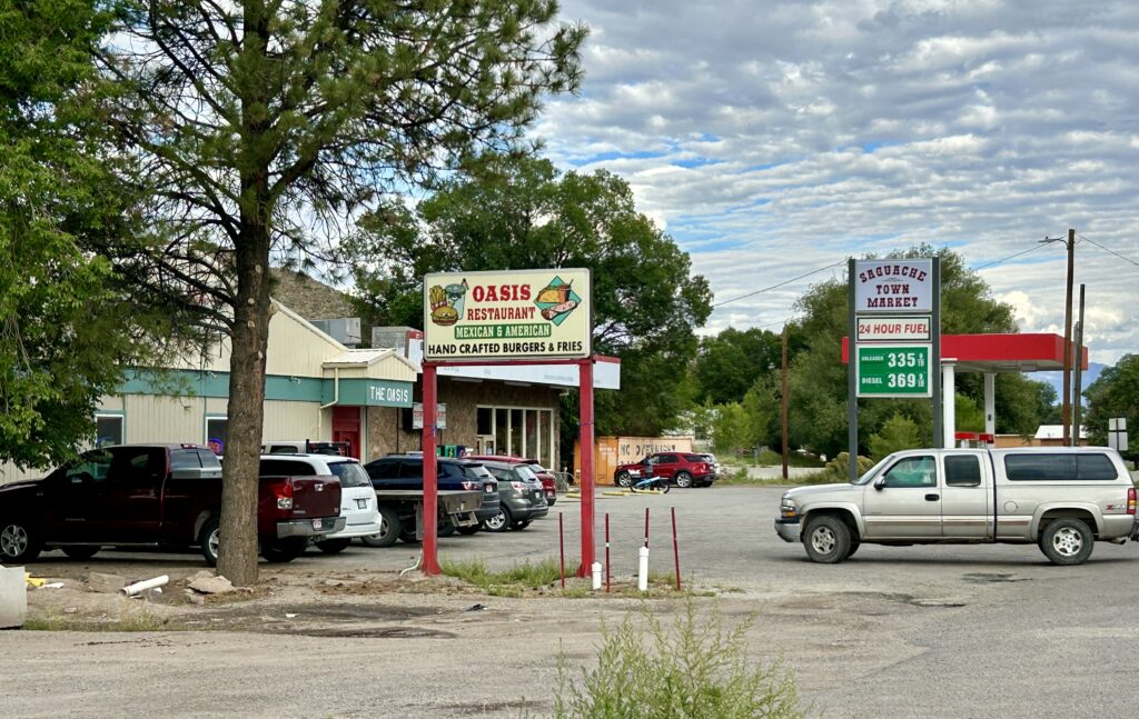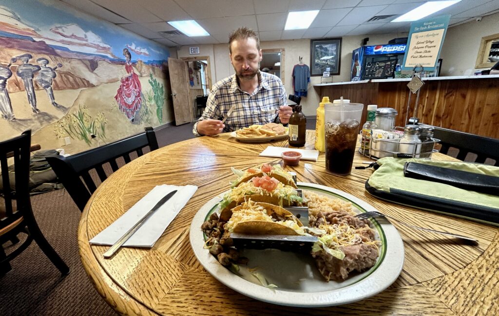 Borec nám zastavuje na benzince, je zde také obchod s potravinami a vedle mexická restaurace. Nejprve nakupujeme jídlo na čtyři dny, pak se jdeme najíst k mexičanům. Martin si objednává hamburger a já kuřecí tacos s rýží a fazolemi, k tomu pivo a pepsi. Jídla je hodně a chutná nám. Dobíjíme si elektroniku a peru na toaletách ponožky, teče z nich černá voda a nechce přestat.