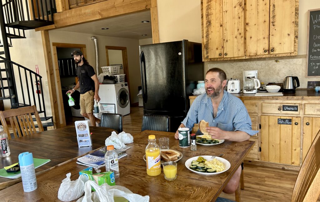 Po šesté jsem vzhůru, vařím si kafe. Většina hikerů odchází, mají domluvený ranní odvoz na trail. My nespěcháme. K snídani smažíme vajíčka. Voláme z wifi domů. Kolem půl deváté odcházíme, líbilo se nám tu.