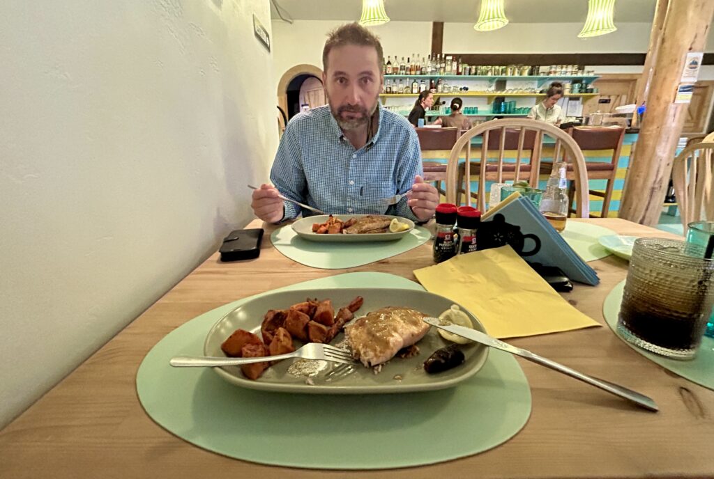 Večeříme v restauraci patřící hostelu pečeného lososa se sladkými bramborami, je to výborné. K tomu pití a pistáciový desert jeden napůl. Platíme za osobu 36 $. Ještěže budeme další čtyři dny v horách. Výška 2.650 m.