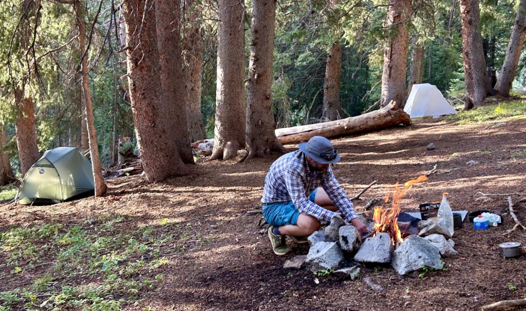 Před šestou hodinou si stavíme stany. Je zde dokonce ohniště a nachystané dřevo. To se nedá jen tak přehlídnout. Po včerejším lijáku je sice všechno ještě mokré, ale oheň stejně za chvíli hoří. Vaříme si na něm horkou vodu na zalití dehydrovaného jídla. Dnes máme vepřové s rýží, je to skvělé. Ušetřili jsme plyn, akorát smrdíme od ohně a všechno máme očouzené, ale jsme šťastni.