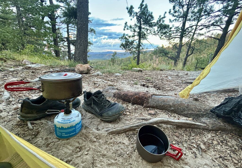 Vstupujeme do La Garita Wilderness. Obědváme u malého pramínku, vařím nudlovou polévku, kafe a čaj. Na bagel mažu máslo a přidávám šunku z kapsičky. Začínáme víc jíst.