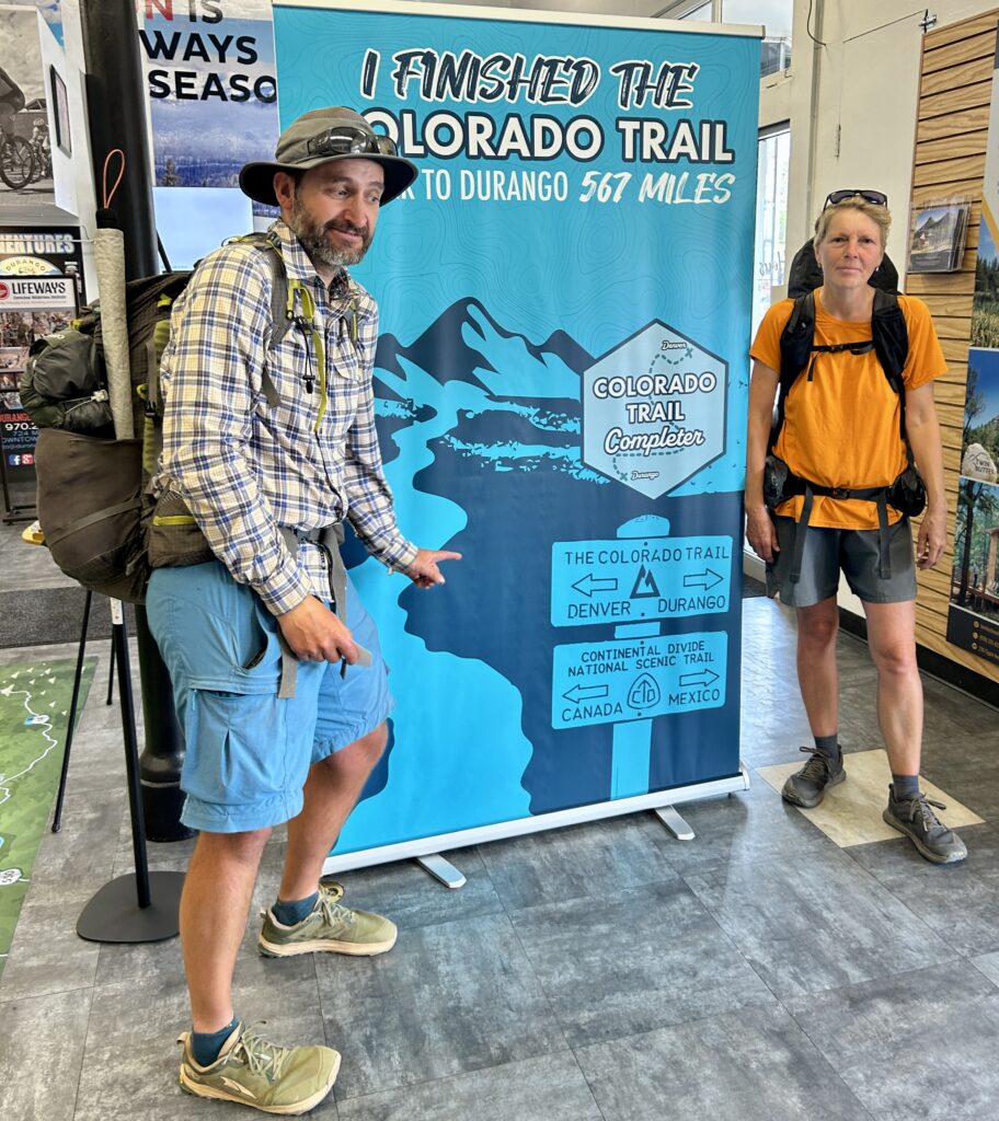 Nejprve jdeme do Welcome Centra, kde je pro Colorado Trail hikery register a poster u které se thru hikeři fotí. Od obsluhy dostáváme nálepku a nášivku CT. Gratulují nám, jsou moc milí. Posílají nás do restaurace Carver Brewing C, CT hikeři tam dostanou pivo zdarma a údajně tam i dobře vaří. Stejně máme hlad, tak jdeme.