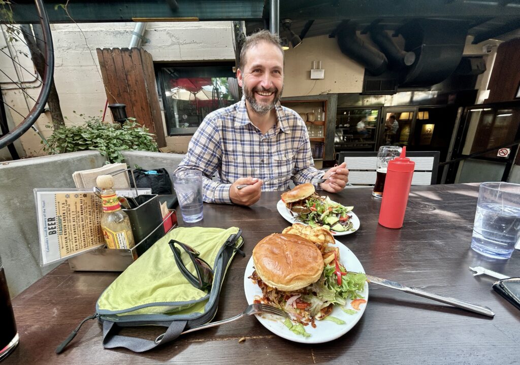 V restauraci si objednáváme burgera a je to ten nejlepší burger co jsme v Coloradu jedli. Dostáváme zdarma tmavé pivo a colu. Marťa si tu ještě kupuje triko Colorado Trailu.