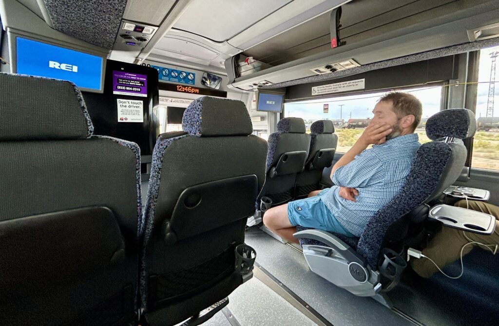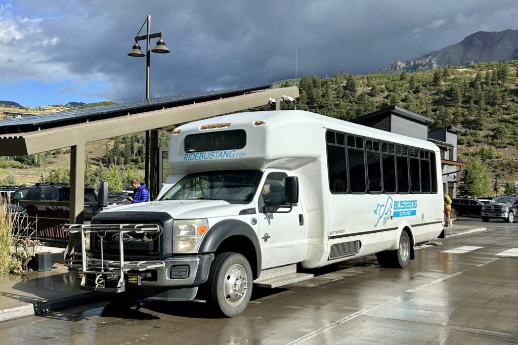 Očekáváme luxusní autobus se záchodem, tak jak to je napsáno na webu společnosti Bustang, ale přijíždí malý městský bus. Karty zde neberou, pouze hotovost nebo platbu přes aplikaci. Lístek do Grand Junction stojí 43 $. Za řidičem sedí paní průvodčí, platím jí v hotovosti 86 $. Na další autobus do Denveru už musím lístky koupit přes aplikaci. Hotovost nám došla. Celkem nás je v autobuse osm cestujících. Jedeme pomalu, přes hory, autobus se třepe, sedadla nemají odpružení. Cesta by měla trvat 6 hodin, tak uvidíme. Je to dobrodružství.