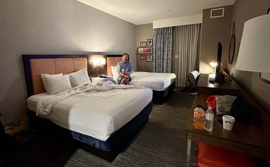 Je 9 večer, náš hotel je od nádraží 1 míli. Rádi se po 14,5 hodinách v autobuse projdeme. Kupujeme si kus pizzy, hlad máme značný. Před desátou jsme na hotelu, platíme 130 $ za noc. V ceně je snídaně. Hotel je luxusní, pokoj parádní.