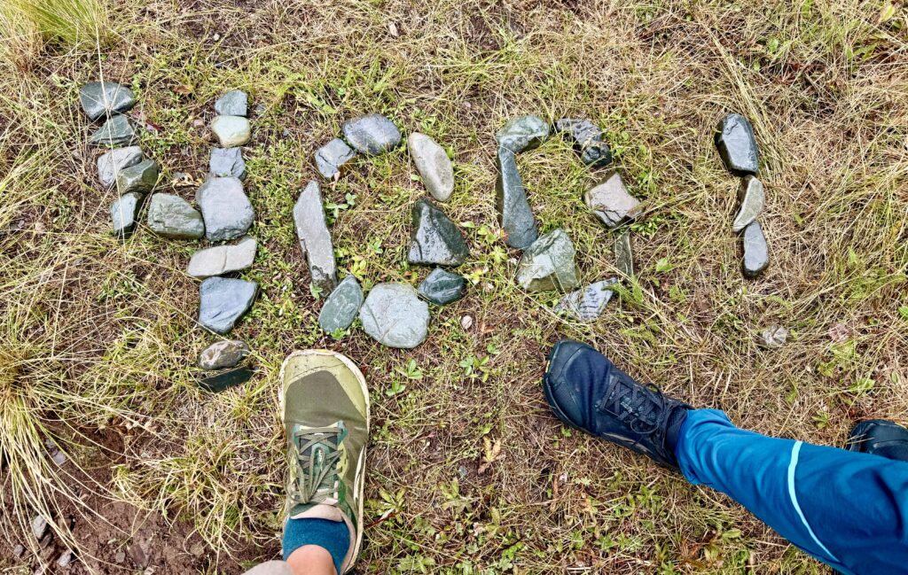 Stezka vede přes několik malých vrcholů, přejdeme je a pokračujeme už jen z kopce. Zastavujeme na 300. míli, z kamínků si stavíme číslice a fotíme se. Nějak rychle těch tři sta mil uteklo.